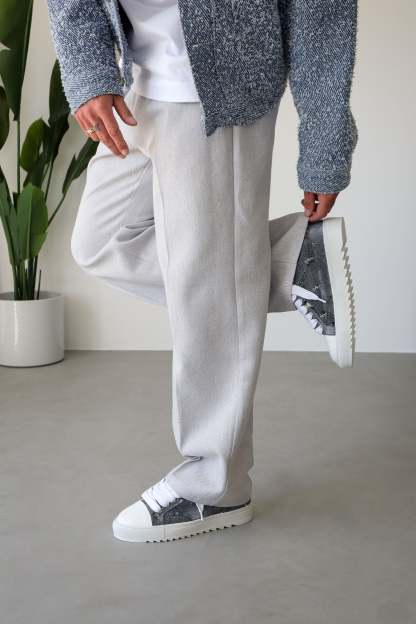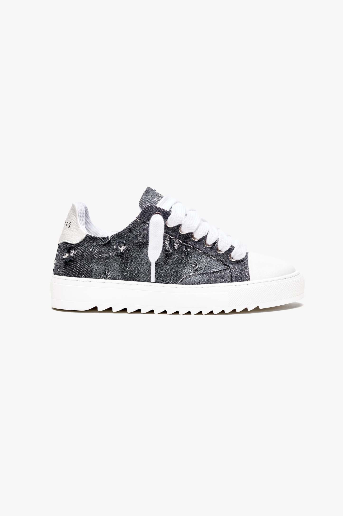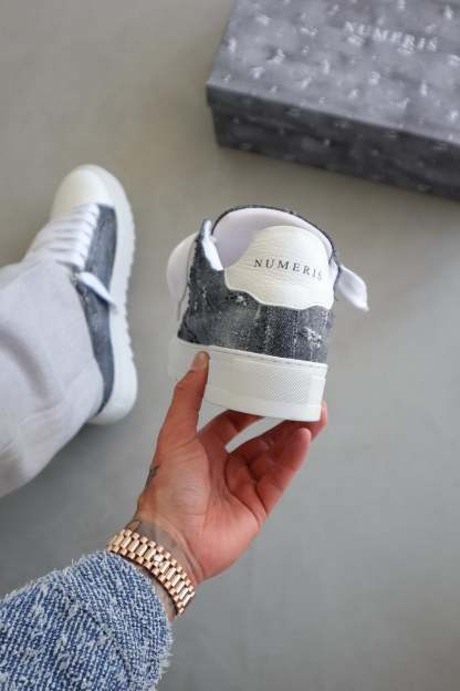 The Thrashed Denim trainer is a celebration of freedom and self-expression. Crafted with meticulous attention to detail, its bespoke hand-distressed washed denim upper is the result of an extensive development process. It took time to perfect the ideal wash, carefully refining techniques to achieve the signature "thrashed" look—ensuring a balance of character and wearability. This dedication to detail means no two pairs will ever bear the same distressed pattern, making each one a unique work of art. Complementing this distinctive feature is the signature crisp white pebbled leather toe cap, adding a touch of sophistication to the design. Inside, the trainer boasts a comfortable collar lining that enhances the overall wear experience. The finishing touches include our distinctive Numeriś branding on the heel, accompanied by the style-defining slogan, 'Design is thinking made visual.”