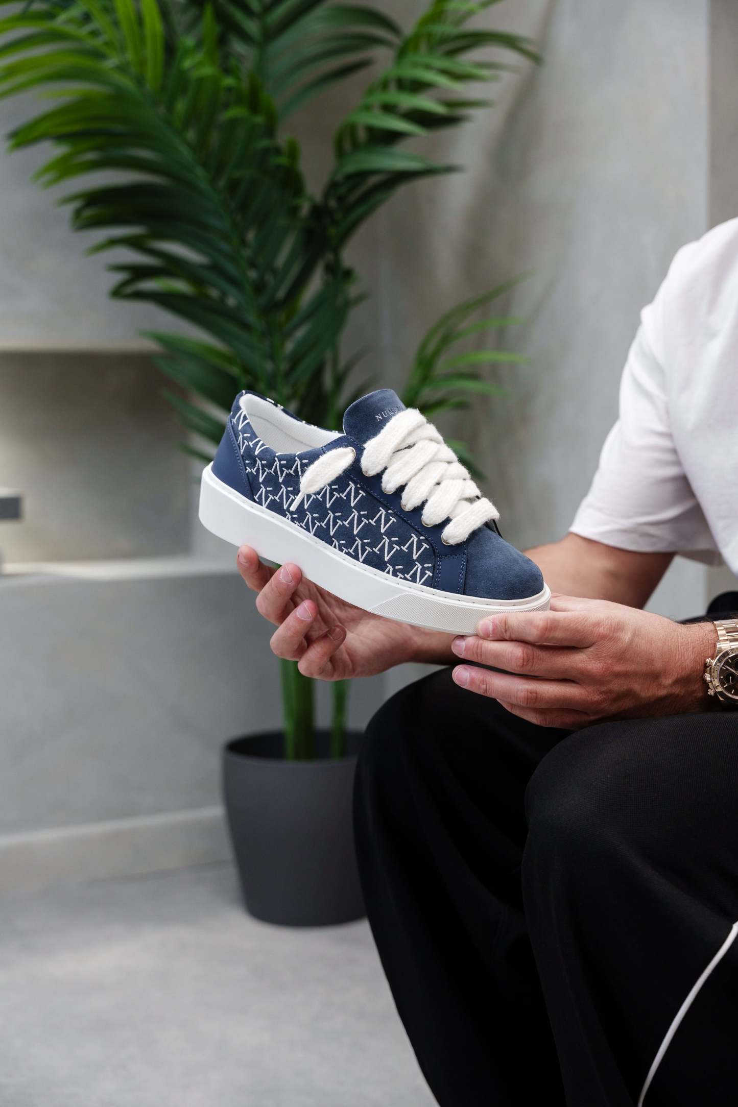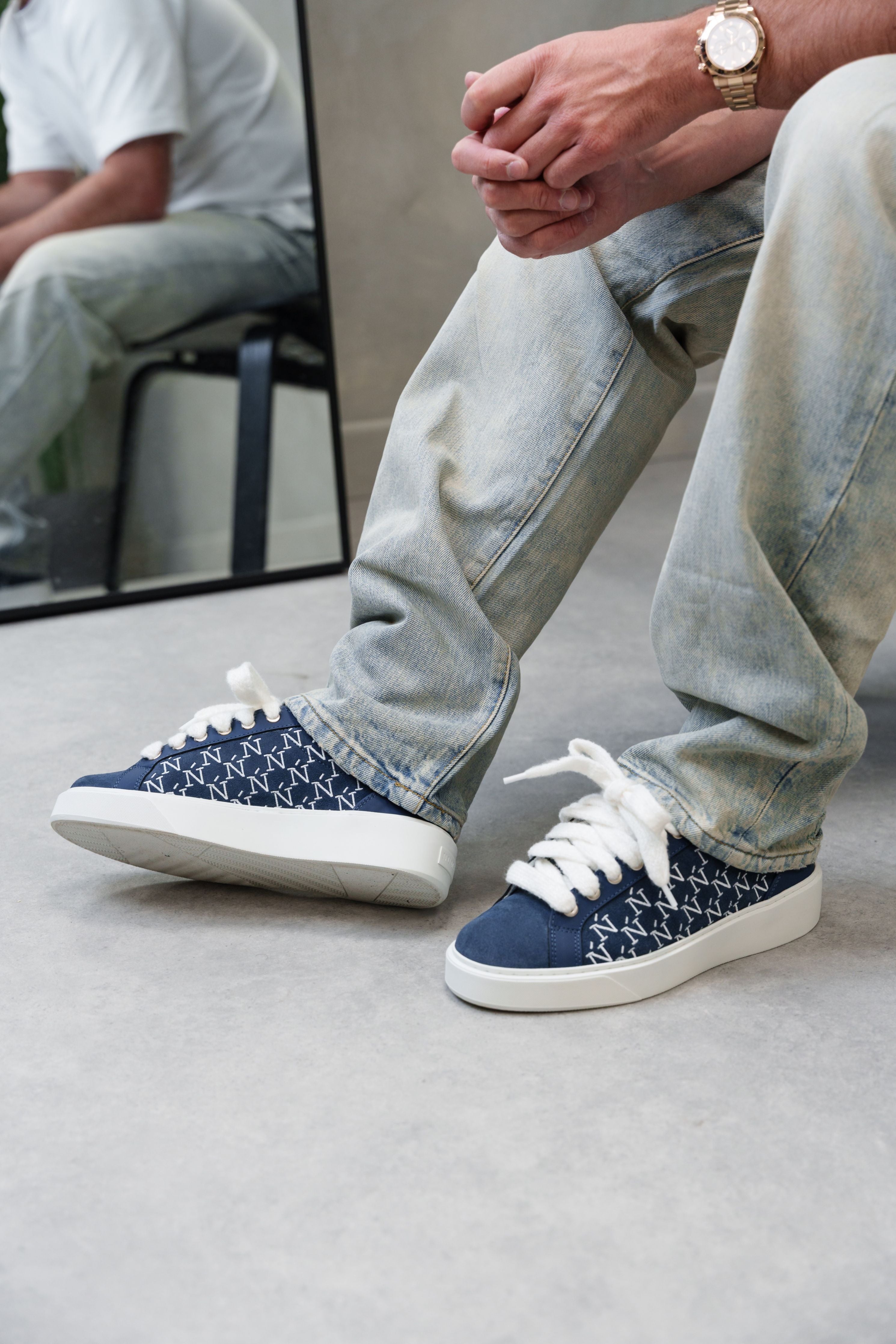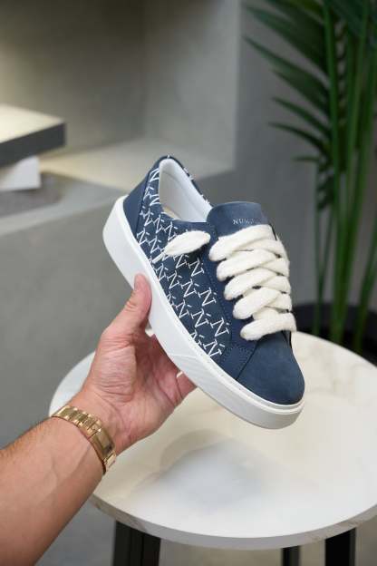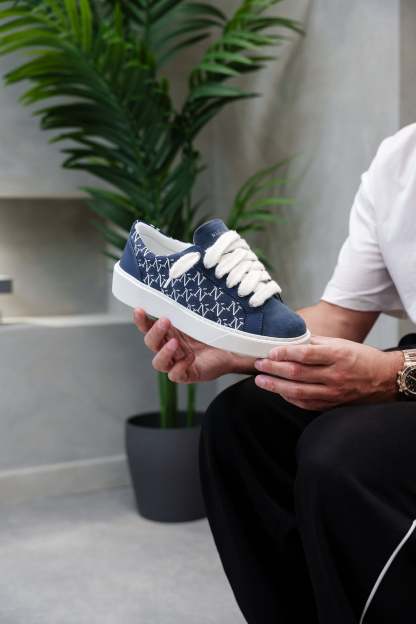 The Sigńet sneaker features Italian a rich navy blue suede, bespoke leather reinforced by TPU running down the eyestay and heel, matching side panels which are accompanied by our sleek hand embroidered Ń monogram logo and 10mm mohair white laces. The interior of the sneaker features white collar lining providing unrivalled comfort. The upper rests perfectly on top of our brand new complex rubber sole, exclusively made for Sigńet. Our distinct silver logo is positioned across the tongue.