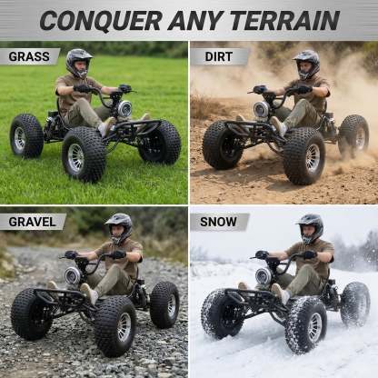 Zyliathor electric off-road go kart delivers strong, quiet, long-lasting performance with a 72V 3000W brushless motor and peak 10.8kW output for real trail excitement. Top speed up to 62MPH (varies by rider weight, terrain, and speed mode). Built for teens & adults; rider height 4'7"–6'7".