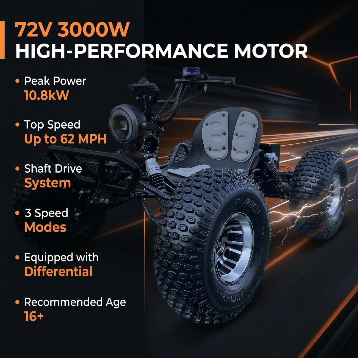 【72V BRUSHLESS POWER | 3000W (PEAK 10.8kW) + UP TO 62MPH】