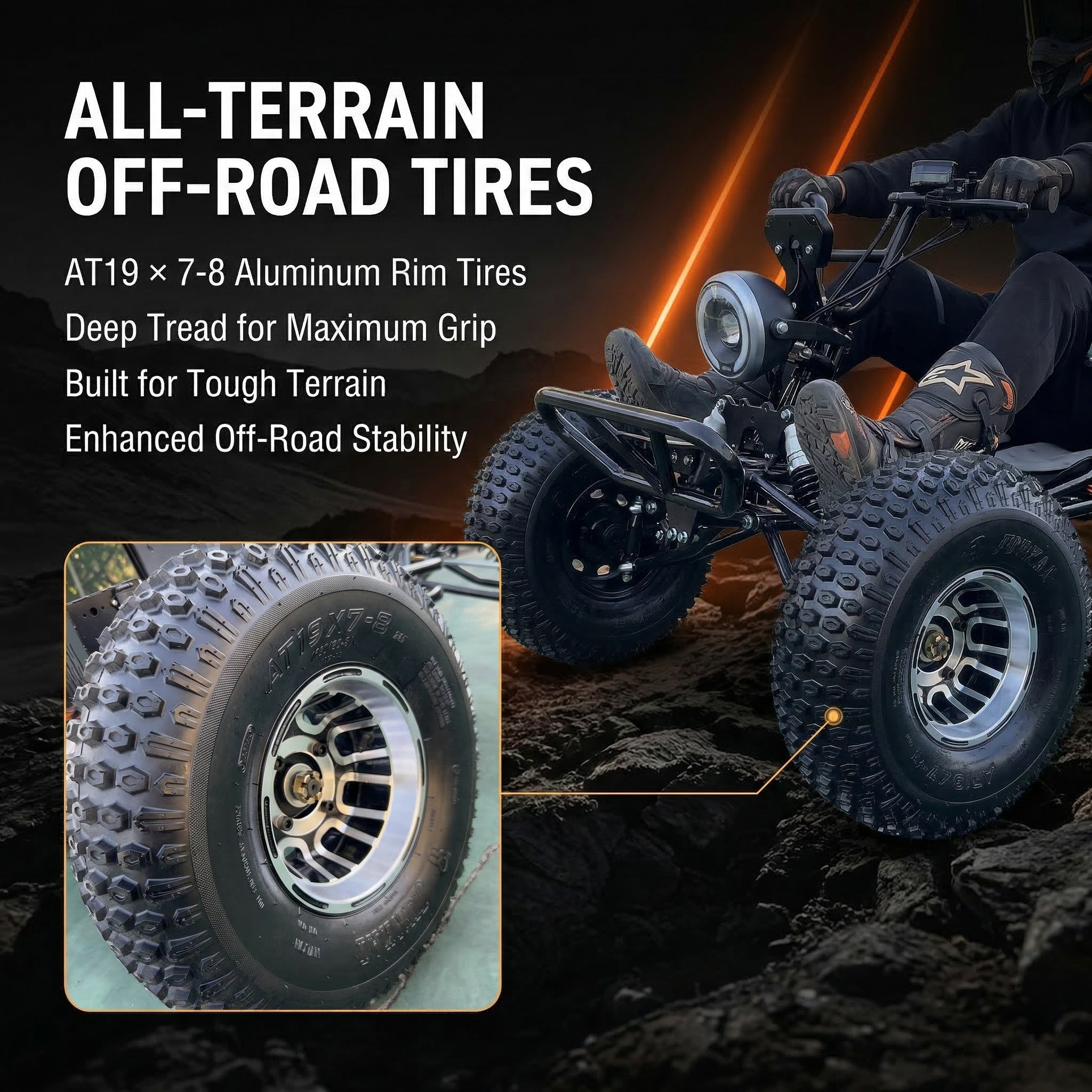 Shaft drive with differential delivers smooth power transfer and stable handling as surfaces change. Rear 4-link suspension absorbs bumps and ruts for a more planted ride across backyard/private trails, sand, grass, mud, dirt, and gravel. Tire option: 19x7-8 for stronger off-road traction, or 13x5-6 for lighter, more efficient riding.