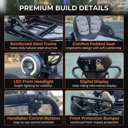 Reinforced steel tube chassis keeps the ride solid on rough ground. Dual hydraulic rear disc brakes provide responsive stopping, while the bright LED light improves dusk/low-light visibility. Includes a dash display and emergency stop/kill switch for added confidence. 600 lb max load—protective gear recommended.