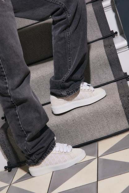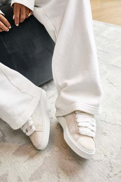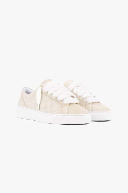 The Sigńet Women’s Sneaker reimagines our signature design with a sleek, versatile update for women. Crafted in Italy from soft light beige suede, it’s detailed with 10mm mohair white laces and matching side panels, highlighted by our hand-embroidered Ń monogram. A smooth white collar lining enhances comfort with every step, while the upper sits gracefully on our newly developed complex rubber sole — created exclusively for the Sigńet. Completing the look, our distinct silver logo is elegantly placed across the tongue, a subtle mark of timeless style.