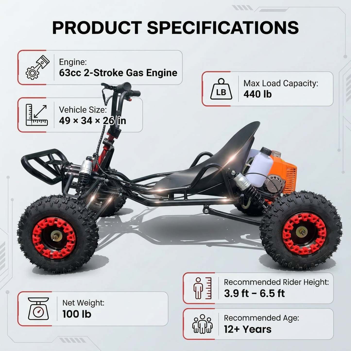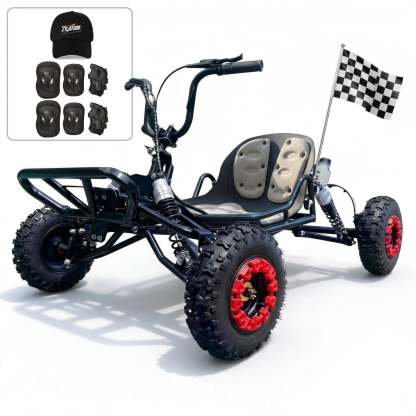Zyliathor 63cc 2-stroke gas off-road go kart for family outdoor entertainment on backyard paths and private property trails—an ideal backyard trail kart and yard kart. EPA compliant. Up to 28MPH (varies) with 440 lb max load. Rider height: 3'11"–6'7" (1.2–2.0 m) (fit may vary).