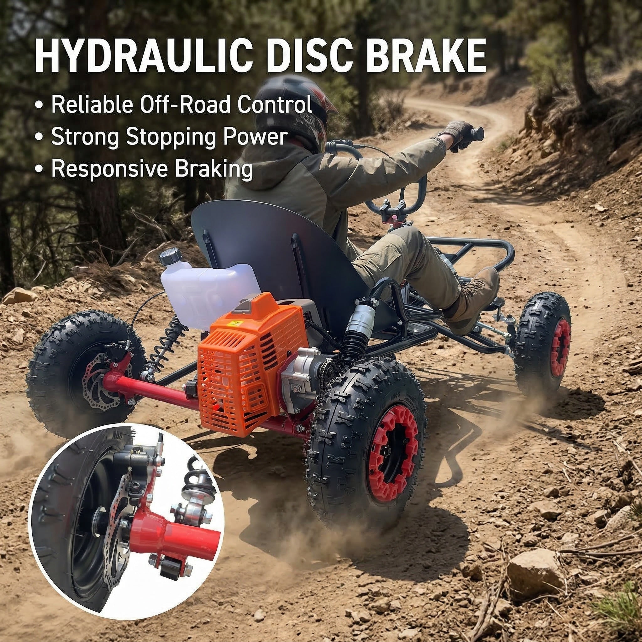Reinforced tubular steel frame and low center of gravity support stable handling and help reduce tipping risk on uneven ground. Hydraulic rear disc brake adds confident stopping control for backyard riding and off-road trails. Helmet/protective gear recommended; adult supervision for minors.